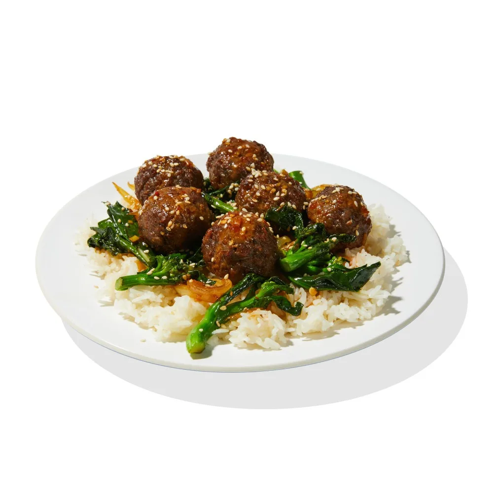 Add neutral cooking oil to a large sauté pan over medium-high heat. Next, add Impossible Meatballs and sear for approximately 2 minutes, stirring occasionally. Add onions, garlic, ginger, and broccoli stems, and cook until soft and and onion is translucent. Add rice wine vinegar, tamari, vegetable stock, and brown sugar to the pan, and stir to combine. Simmer for about 5-7 minutes. Add broccoli florets and cook for an additional minute. Remove from heat and add sesame oil, sambal, and lime juice, stirring to combine all ingredients.